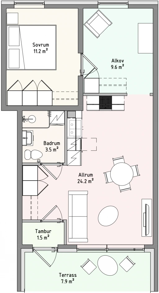 Egen terrass 7,9 ㎡. Vatten och bruksel tillkommer enligt egen förbrukning.
